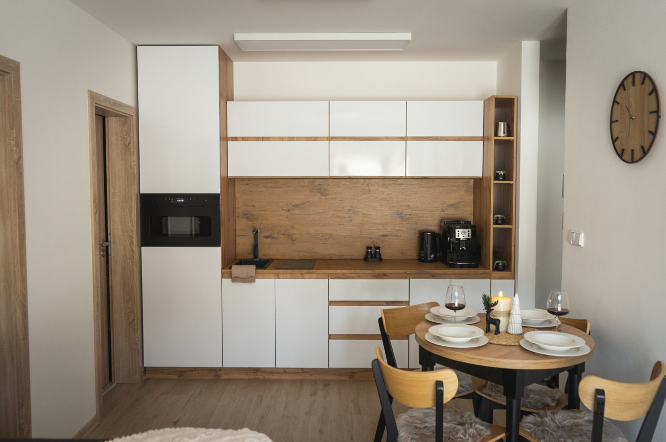 Nachází se zde jídelní servis, hrnce, sklenice, příbory, indukce, mikrovlnná trouba, kávovar, rychlovarná konvice, horkovzdušná trouba a myčka